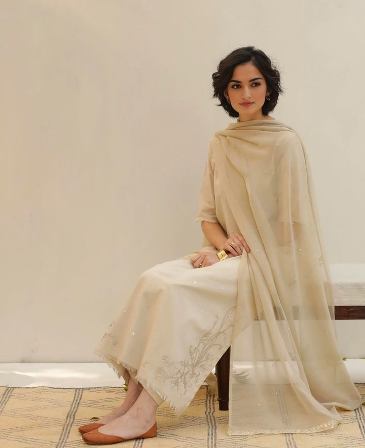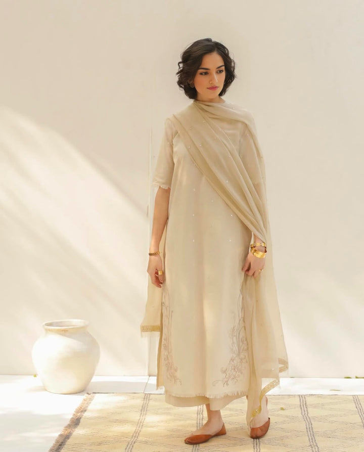 The straight-cut shirt features delicate floral embroidery along the hemline, complemented by subtle shimmer and fringed detailing for a soft, artisanal finish. Paired with coordinated trousers and a sheer organza dupatta adorned with minimal sequin-like embellishments, this outfit embodies timeless grace.