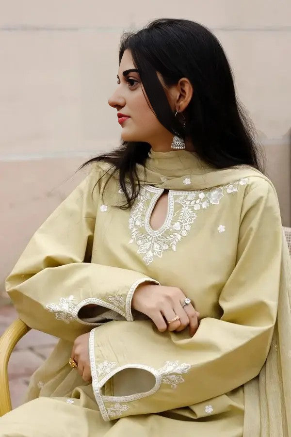Introducing the Apple Mist Outfit, a beautifully embroidered 3-piece stitched lawn suit designed for women who appreciate both traditional elegance and modern fashion.