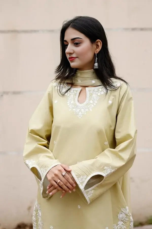 The signature Apple Mist color paired with fine white floral embroidery creates a refreshing and feminine look that is elegant yet understated. Its relaxed silhouette ensures comfort while maintaining effortless style, making it perfect for Eid, brunches, festive gatherings, and semi-formal occasions.