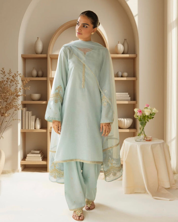 Aqua Bloom Outfit – 3-Piece Satin Suit with Golden Embroidery & Organza Dupatta | Luxury Festive Collection