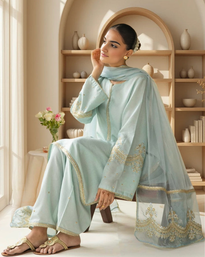 Its soft mint-aqua pastel tone makes this ensemble ideal for festive gatherings, weddings, and formal occasions. Designed to be both lightweight and breathable, it provides comfort without compromising on luxury.