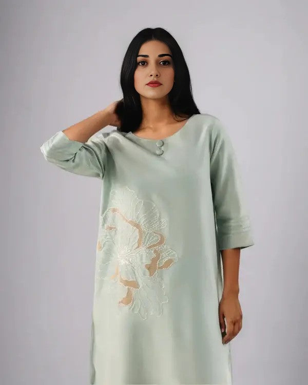 The shirt features intricate floral embroidery in white and beige tones across the front panel, paired with a round neckline and fabric buttons for a touch of sophistication. Its 3/4 pleated sleeves complete the refined silhouette, blending tradition with modern charm.