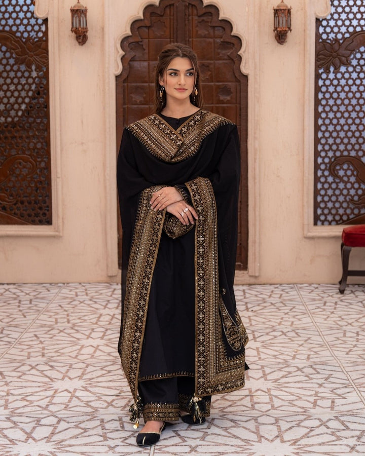 Black Mystique Outfit – Luxury 3-Piece Stitched Suit in Lawn & Cotton Satin with Golden Embroidery | HareemOfficial 2025 Collection