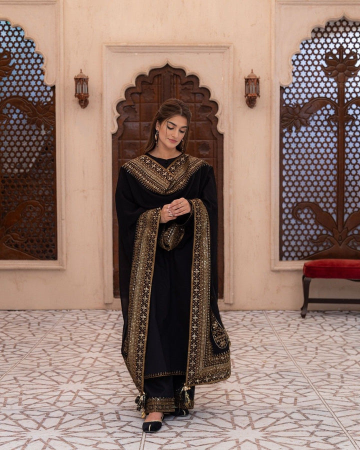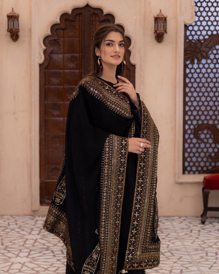 The Black Mystique Outfit is an epitome of timeless luxury and refined elegance, crafted for women who embrace sophistication.
