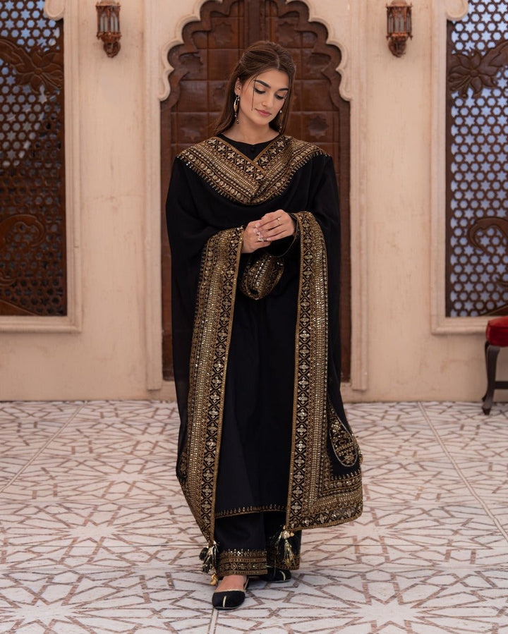Designed for evening soirees, festive gatherings, and formal events, Black Mystique embodies mystery, allure, and unmatched charm. Pair it with gold jewelry and embellished heels for a regal finish.