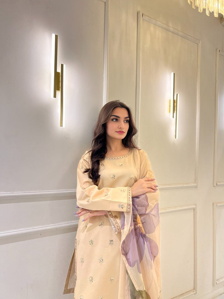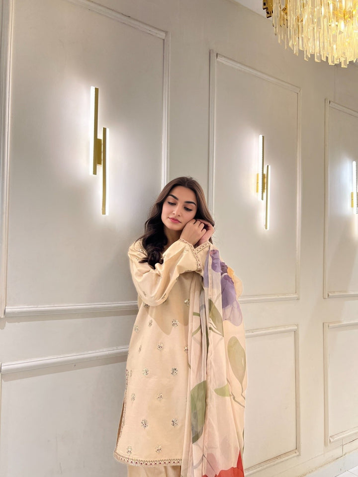 Completing the ensemble is a digitally printed chiffon dupatta with tassel edges, adding a playful yet graceful touch. Perfect for Eid, intimate gatherings, or festive occasions, Desert Bloom is the epitome of understated luxury and calm sophistication.