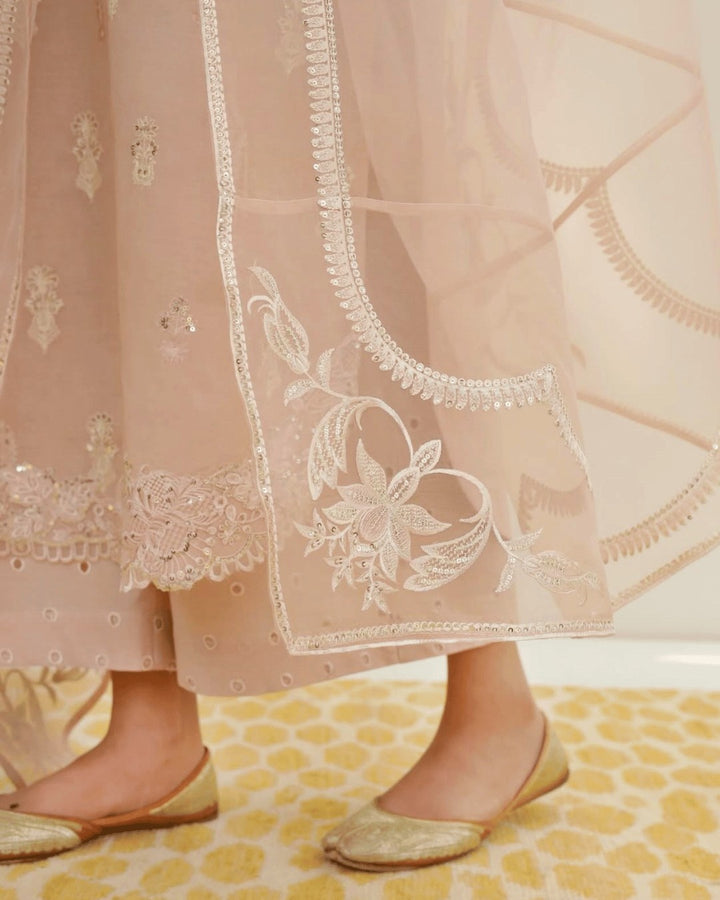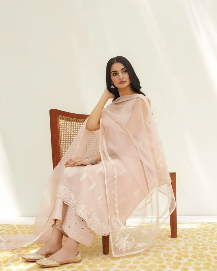 Crafted from premium lawn fabric, the shirt features refined embroidery from neckline to hem, paired with sleek straight trousers enhanced by delicate eyelet accents. A sheer organza dupatta, beautifully embroidered with floral patterns, completes the ensemble with grace and sophistication.